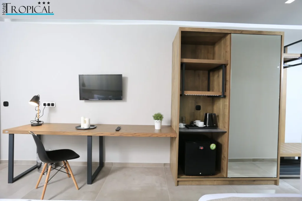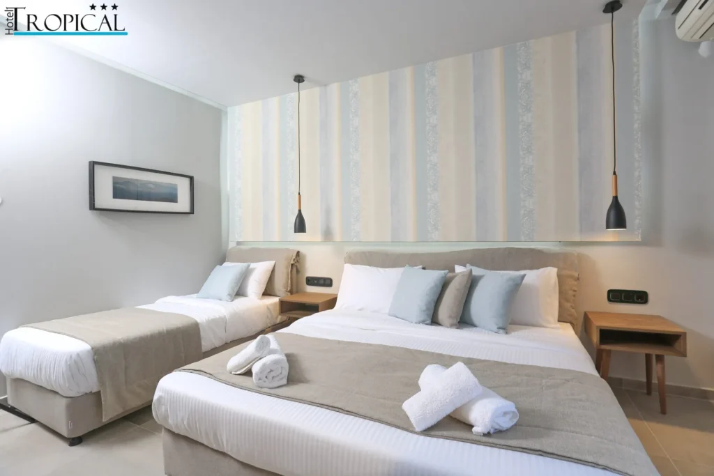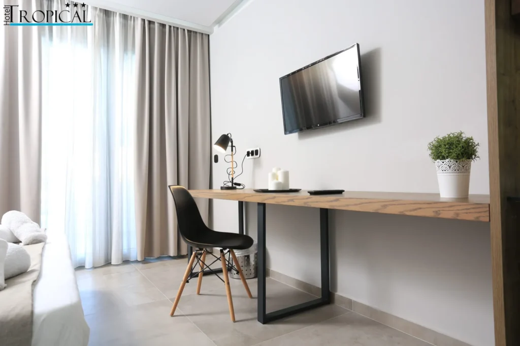 Τα Executive δωμάτια του ξενοδοχείου Tropical αποτελούν δικαίως μοναδική επιλογή για κάθε ταξιδιώτη που αποφασίζει να επισκεφτεί τη Χανιώτη. Άνετα και πολυτελή, με μοντέρνα διακόσμηση και θέα στο κήπο ή την πισίνα του ξενοδοχείου σε κάνουν να αισθάνεσαι τόσο άνετα όσο ποτέ.